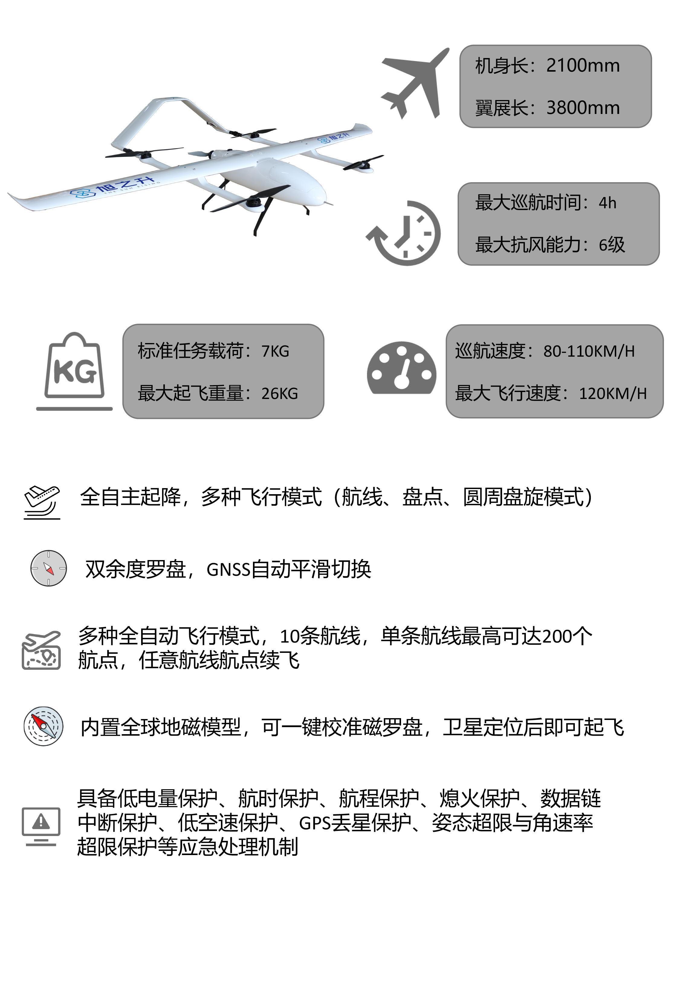 全自主起降,多種飛行模式(航線、盤點、圓周盤旋模式)。雙余度羅盤,GNSS自動平滑切換。多種全自動飛行模式,10條航線,單條航線最高可達200個航點,任意航線航點續飛。內置全球地磁模型,可一鍵校準磁羅盤,衛星定位后即可起飛。具備低電量保護、航時保護、航程保護、熄火保護、數據鏈中斷保護、低空速保護、GPS丟星保護、姿態超限與角速率超限保護等應急處理機制。支持多種任務載荷,可配備正射模塊、傾斜攝影模塊、可見光視頻模塊、熱紅外視頻模塊、多光譜遙感模塊等,可快速實現多元化數據的獲取,在測量測繪、數字孿生城市、文化遺產、考古測量、地質勘測、礦山測量、災情調查、電力勘察、事故勘察、刑事偵查、環境保護、林業等行業用途廣泛,真正做到了一機多用。