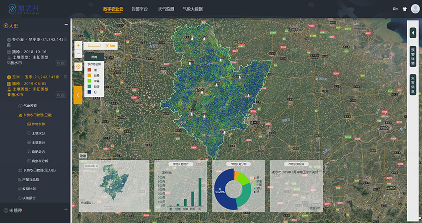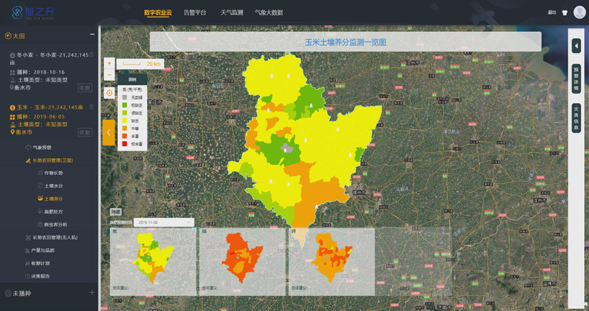 經過多年的數據積累,我公司已儲備多個區域的無人機遙感數據、衛星遙感數據、光譜遙感數據以及矢量數據等;為了在精準農業領域得到更完善的應用,我公司聯合中國科學院和中國氣象科學院下屬職能單位聯合開發了精準農業大數據數字云管理平臺,現可根據用戶需求進行靈活定制開發,以農業智能信息處理技術、大數據分析技術、農業遙感技術與地理信息系統為依托,以農業災害云、農業遙感云、作物表型云和土壤云為支撐,進行源頭技術創新、技術平臺構建和農業大數據產品研發,提供地塊精細化管理、作物精細化管理、農氣災害預警、土壤肥力管理、病蟲害監測、精準灌溉施肥以及大數據可視化服務,致力于打造全維度、高精度的精準農業大數據服務平臺,為三農服務,助力鄉村振興。